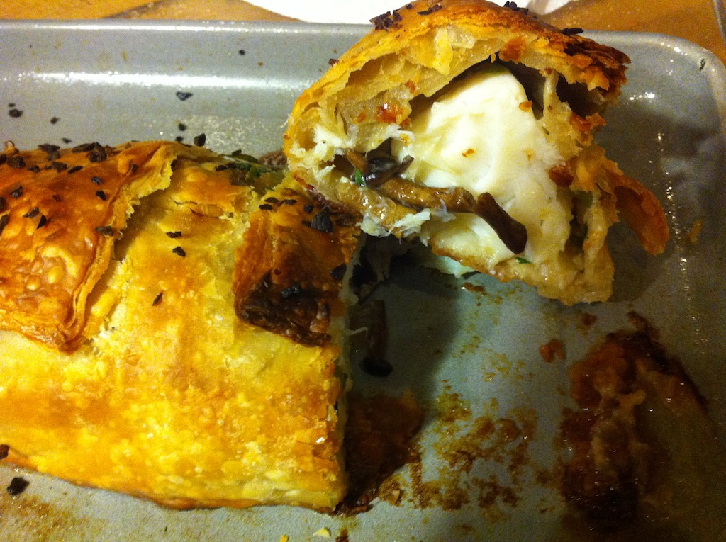 Questa volta il baccala’, che e’ considerato un piatto invernale, si riscalda con una coperta di pasta sfoglia in compagnia dei funghi trifolati. Il baccala’ cosi ricoperto costituisce un piatto prelibato e raffinato.