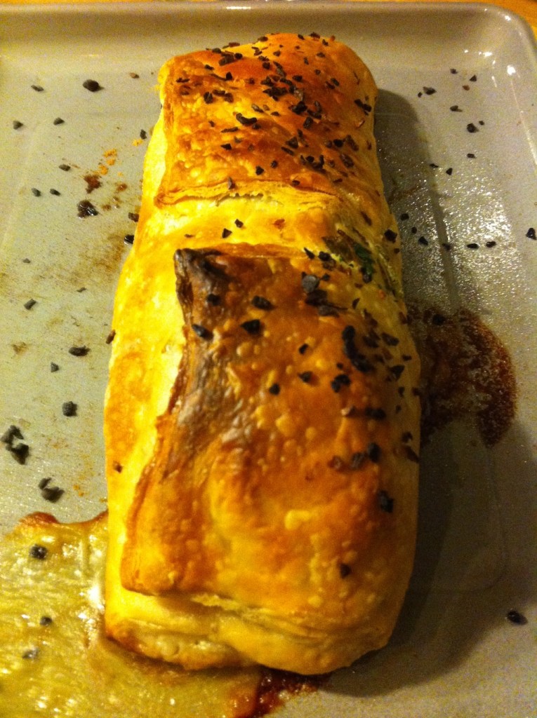 Scongeliamo i funghi, mettiamoli in padella e lasciamo evaporare la parte liquida. Soffriggiamo in una padella uno spicchio d’aglio con l’olio. Eliminiamo l’aglio, aggiungiamo i funghi e lasciamoli rosolare. Aggiungiamo il sale e il prezzemolo. Lasciamoli raffreddare. Stendiamo il rettangolo di pasta sfoglia su di un tavolo di legno e spennelliamolo con del burro fuso. Distribuiamo i funghi trifolati al centro del rettangolo di sfoglia evitando i bordi laterali. Laviamo e asciughiamo con carta da cucina il baccala’, appoggiamolo sui funghi trifolati e aggiungiamo un po’ di olio e sale. Spennelliamo i bordi laterali della sfoglia con dell’uovo sbattuto. Arrotoliamo la pasta sfoglia e sigilliamola con uovo sbattuto. Mettiamo il rotolo con baccala’ e funghi su di una teglia rettangolare e spennelliamo anch’esso con uovo sbattuto. Aggiungiamo la cipolla disidratata. Inforniamo a 200C. per 30 minuti o finche’ il rotolo sarà dorato.