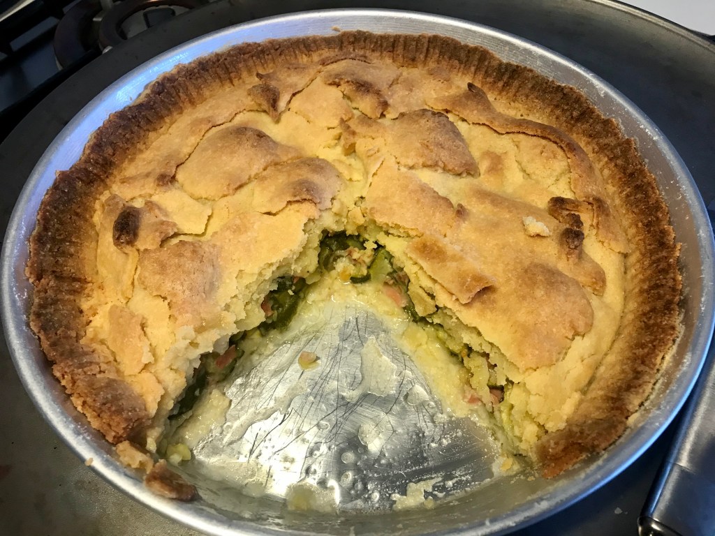 Adoperiamo un foglio di carta da forno per stendere con il matterello la pasta frolla che trasferiremo su di una teglia dal diametro di 24 cm. Distribuiamoci sopra le zucchine, su di essa dei tocchetti di burro e dell’olio Evo. Completiamo la pizza con un altro disco di pasta frolla. Facciamo aderire bene i bordi della pizza adoperando una forchetta infarinata. Inforniamo a 180C. per 40-50 minuti o finche’ la pizza sarà ben colorita.