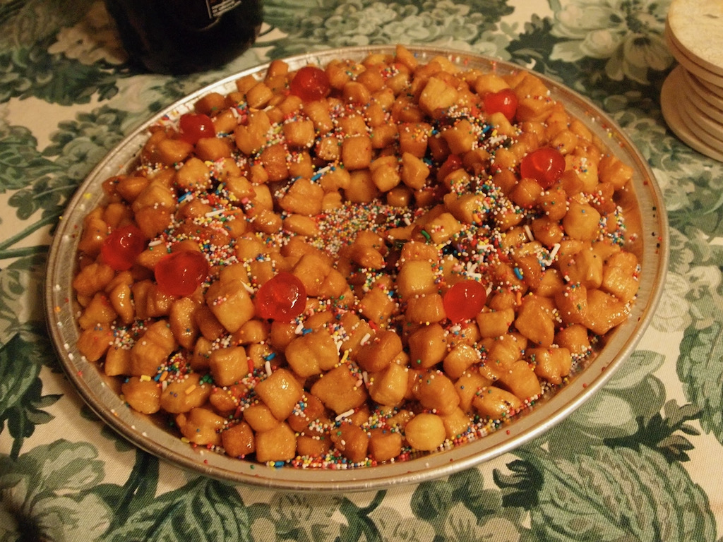 Prepariamo con tutti gli ingredienti una pasta di media consistenza, lasciamola riposare coperta per almeno un ora e poi, con l’aiuto di un matterello, stendiamola dello spessore di un centimetro. Tagliamola prima verticalmente e poi orizzontalmente in tanti piccoli quadratini aiutandoci con un po’ di farina. Riscaldiamo l’olio e friggiamo gli struffoli a temperatura moderata un po’ alla volta rigirandoli continuamente. Essi si arrotonderanno e diventeranno piacevolmente dorati. Quando nella padella si formerà troppa schiuma e’ il momento di sostituire l’olio. Sgoccioliamoli bene su carta assorbente, mettiamoli da parte e continuiamo a friggere e a sgocciolare fino ad esaurimento degli stessi. In una pentola capiente mettiamo il miele, lo zucchero e le due dita di acqua e portiamo ad ebollizione. Si formerà una schiuma e quando poi questa scompare, riduciamo la fiamma al minimo e versiamo gli struffoli. Rigiriamoli bene finche’ non avranno assorbito il miele. Aggiungiamo la frutta candita e mischiamo bene. A questo punto mettiamoli su di un piatto rotondo da portata e, con le mani bagnate, diamogli una forma arrotondata con un buco al centro. Lasciamoli un po’ raffreddare e poi decoriamoli con i confettini colorati.