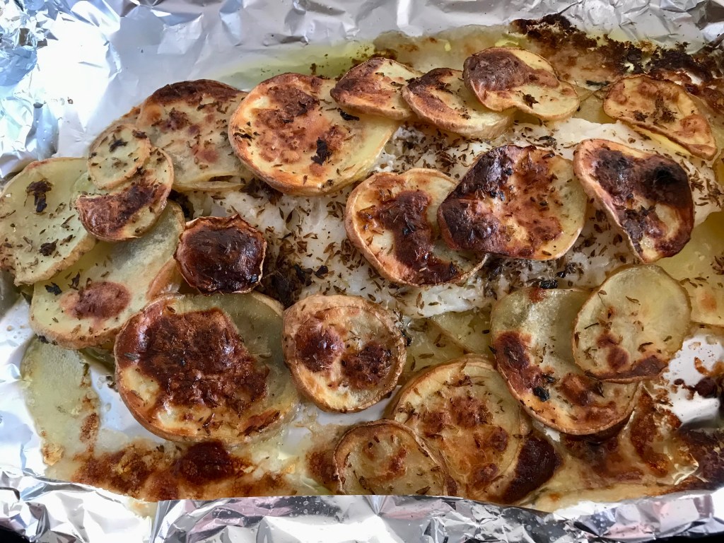 Filetto di cernia; patate; olio Evo; origano e sale q.b.