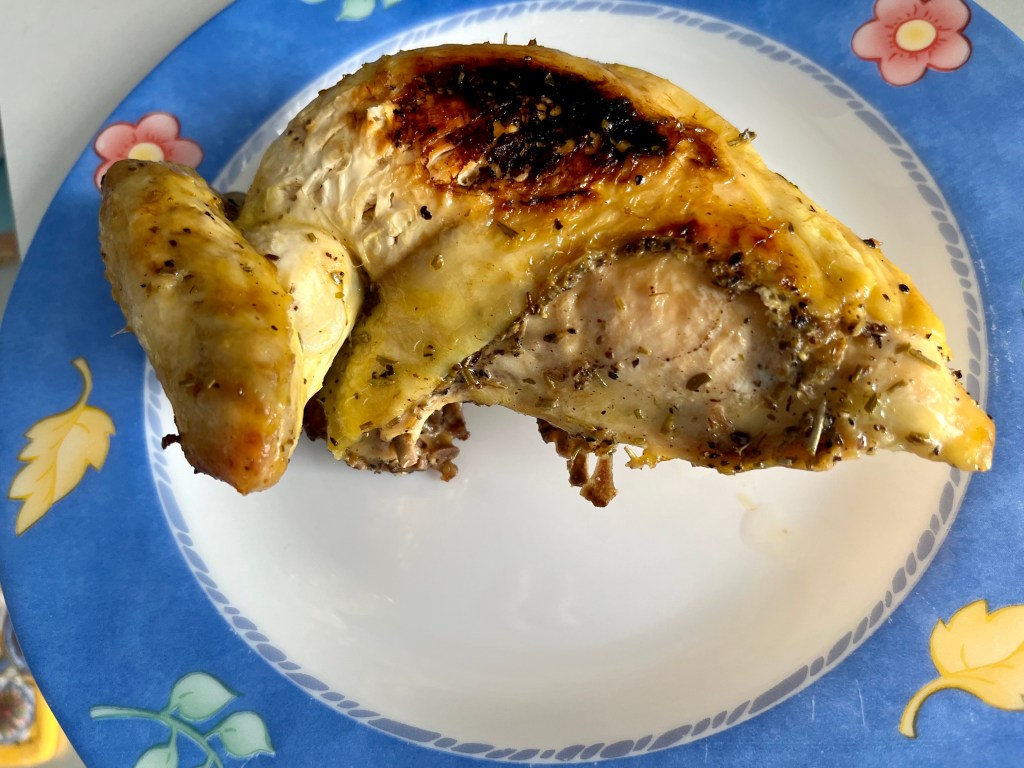 Un quarto di pollastrello (fracassato dal macellaio) di massimo 1kg. ; un battuto di olio, limone, pepe, zenzero, rosmarino, origano e sale.