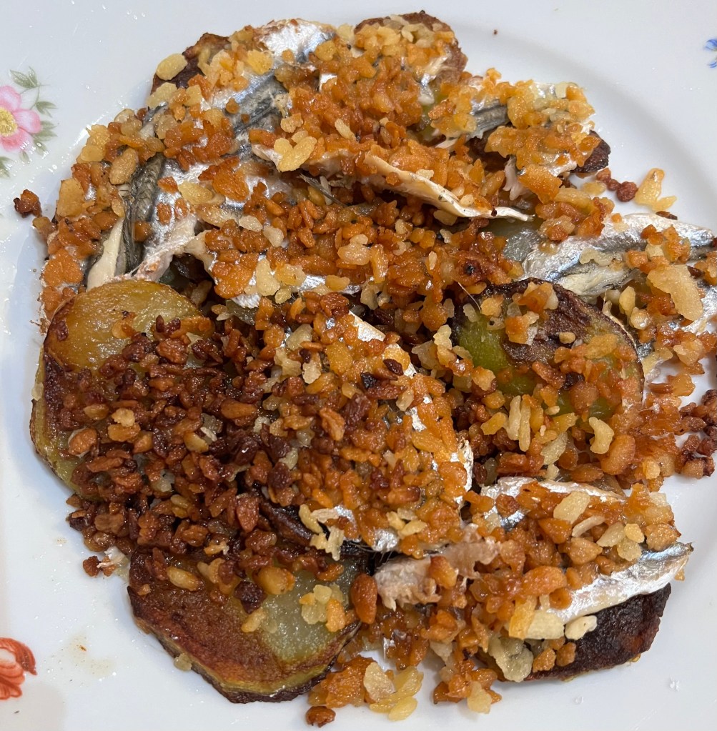 Alici freschissime private di interiora e spine, croccante panatura in fiocchi, patate, uova, alloro e basilico tritati, origano, olio Evo, sale qb.