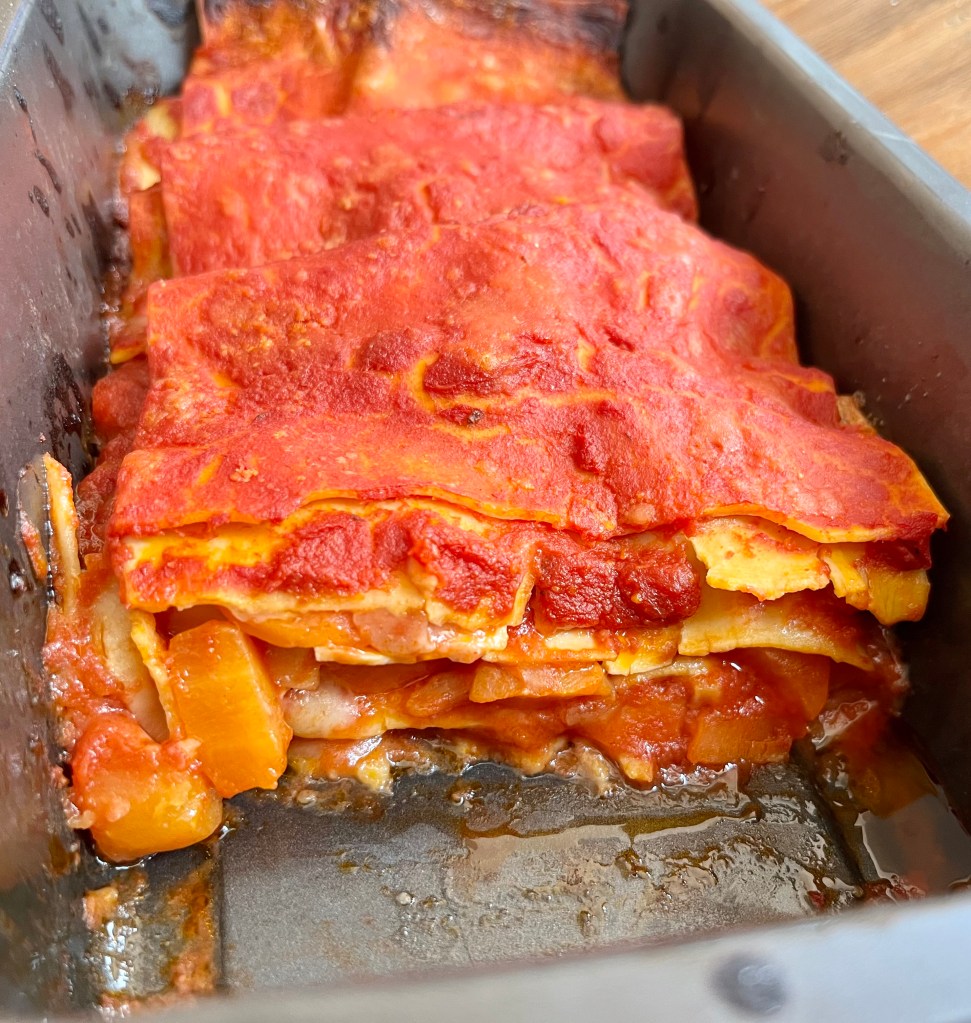 Lasagne all’uovo precotte, sugo di pomodoro, carote fresche, scamorza (oppure provola o fiordilatte) a fettine sottili, parmigiano e pecorino grattugiato insieme, olio Evo, burro, basilico, cipolla tritata, pepe bianco e sale qb.